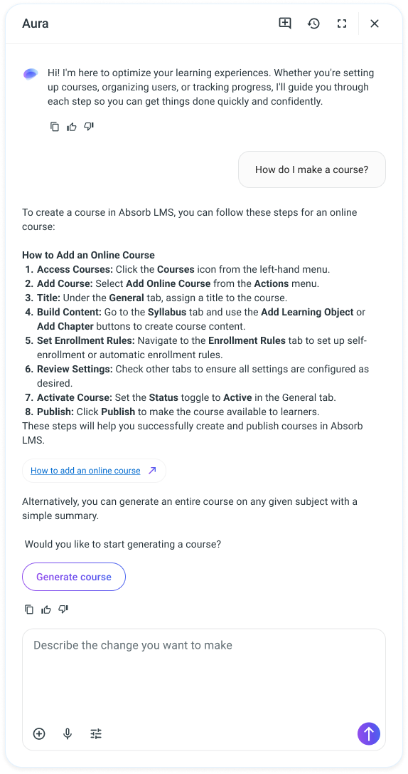 The initial experience focuses on speed and clarity, allowing admins to generate a complete draft course with minimal input. From a short description, Aura produces a structured, article-style course that can be published immediately or reviewed and refined.