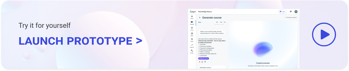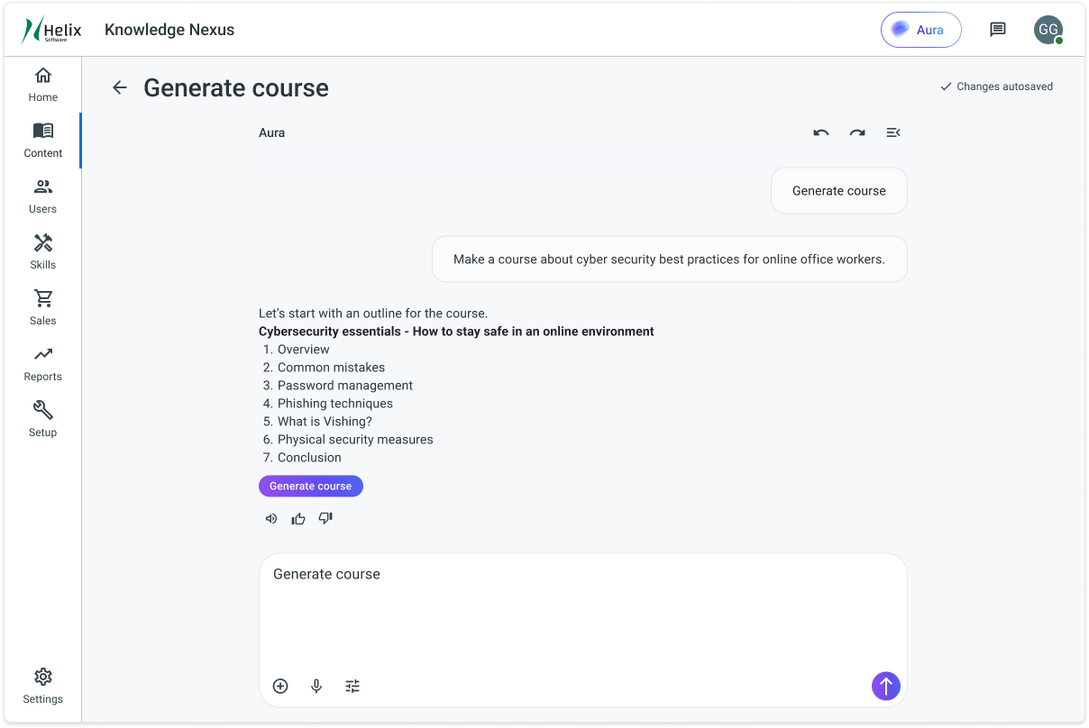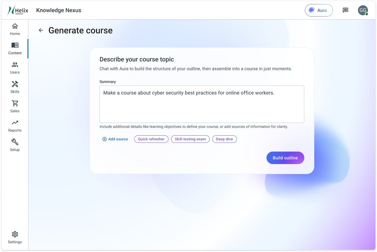 Aura brings proven instructional design principles directly into the course creation flow, removing the need to start from a blank page. By chatting naturally about a course topic, learning goals, or audience, admins can quickly generate a structured outline that reflects best practices in sequencing, clarity, and learner engagement. This lowers the barrier for non-experts while helping experienced designers move faster without sacrificing quality.