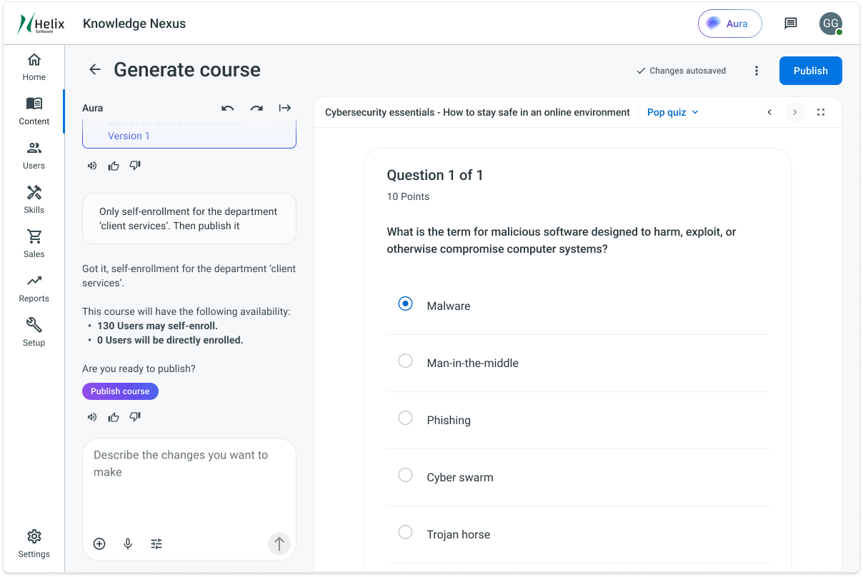 Course creation with Aura builds on a chat experience admins already use for product help and guidance throughout the LMS. Instead of learning a new tool, admins can start a course by simply having a conversation, describing their topic, goals, or constraints in plain language. Aura adapts in real time, asking clarifying questions, refining scope, and shaping content as the discussion evolves, making course creation feel as natural and flexible as getting help elsewhere in the product.
